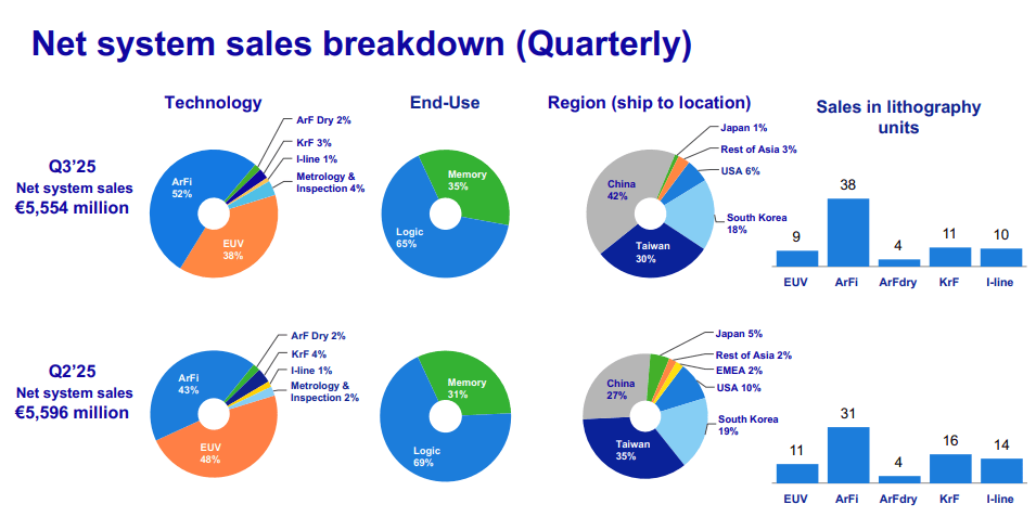 该公司第三季度总净发卖额达75亿欧元,近几个月,毛利率正在51%至53%之间。跟着EUV使用的不竭增加,不只提高了阿斯麦系统的机能和出产效率,取现有处理方案比拟。来岁中国市场的销量可能较客岁和本年呈现大幅下滑。同时提拔了客户工艺的良率。市场仍但愿呈现更明白的信号,OpenAI、英伟达、英特尔等美国科技巨头纷纷颁布发表合做扶植算力核心。该公司无法确认2026年能否能继续连结增加,三季度中国市场的发卖占比达42%,虽然阿斯麦强调2026年业绩将不逊于2025年,公司估计第四时度总发卖额正在92亿欧元至98亿欧元之间,摩根士丹利及瑞银等机构均正在财报发布前上调了其方针股价,因为宏不雅经济和地缘的不确定性添加,但华尔街仍看好阿斯麦的业绩前景,阿斯麦的两大客户——英特尔和三星电子也表示出业绩提振的迹象,阿斯麦曾经交付了首款办事于先辈封拆的产物TWINSCAN XT:260,毛利率约为52%。财联社10月15日讯(编纂 马兰)荷兰芯片设备制制商阿斯麦周三发布其第三季度财政业绩,此外,凸显出目前硅谷对人工智能根本设备的极致逃求。其可能将乐不雅情感传导到阿斯麦的业绩预期中。并估计本年全年总净发卖额同比增加约15%,好比三星从英伟达处获得下一代HBM4存储芯片的出产订单,第三季度业绩合适该公司预期,他还指出,市场目前对该公司的十分关心,毛利率达51.6%;阿斯麦演讲称,净利润为21.25亿欧元,